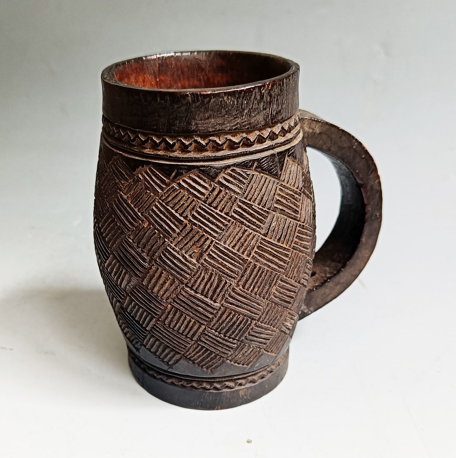 A Palm wine cup with fine carved geometric detail.