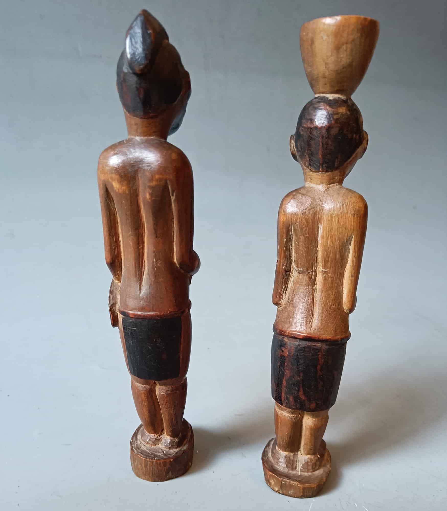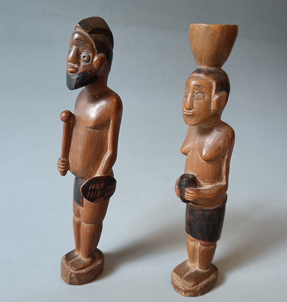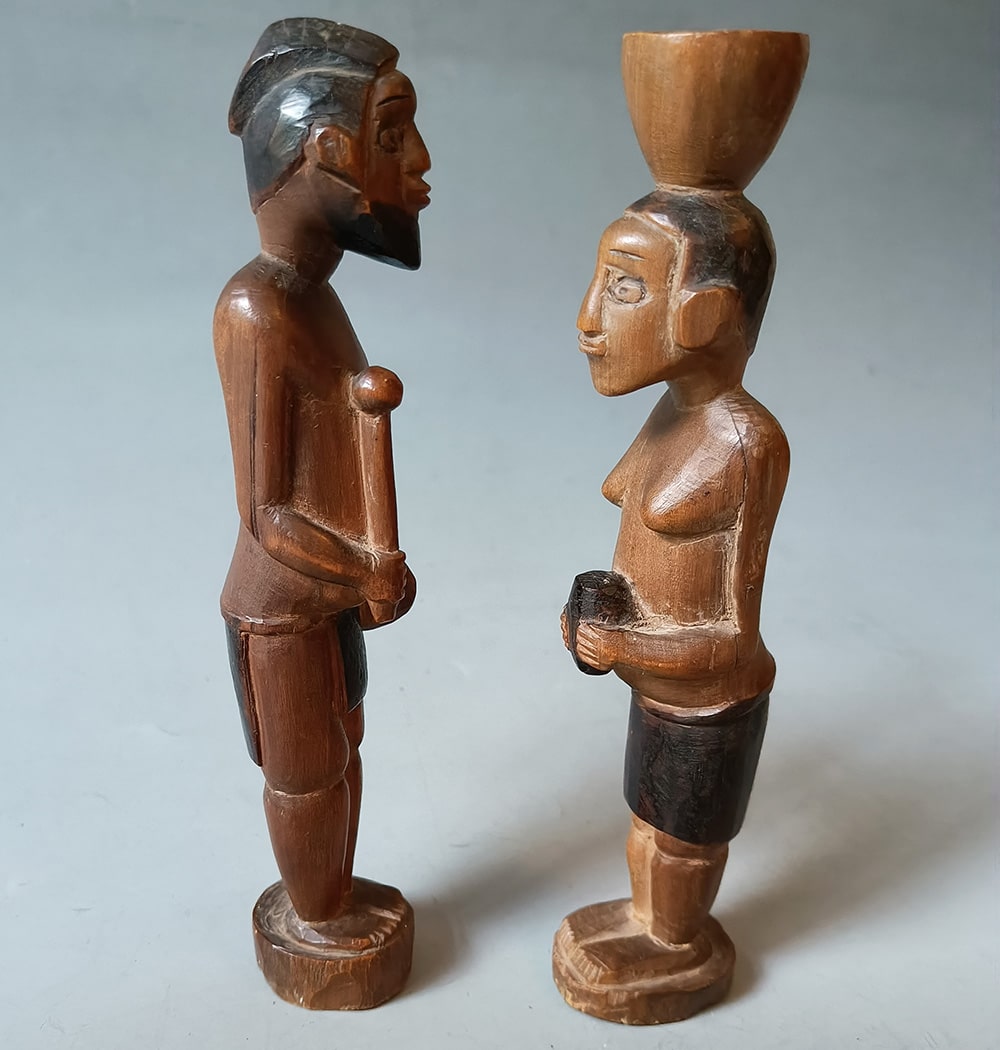 A finely carved pair of traditional Zulu figures from South Africa, attributed to the Baboon Master School, known for its distinctive style and expressive craftsmanship.