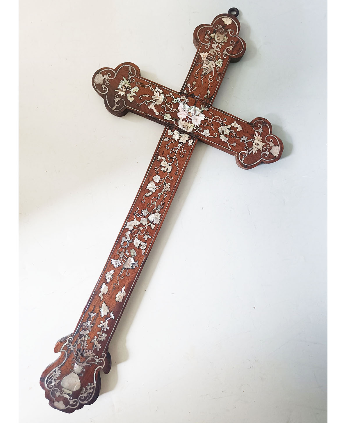 Such pieces were produced in China and Vietnam during the 19th century for Christian communities and missionary markets, combining Western religious form with refined local decorative craftsmanship. The floral inlay patterns and stylized scrolling are characteristic of regional mother-of-pearl work of the period.