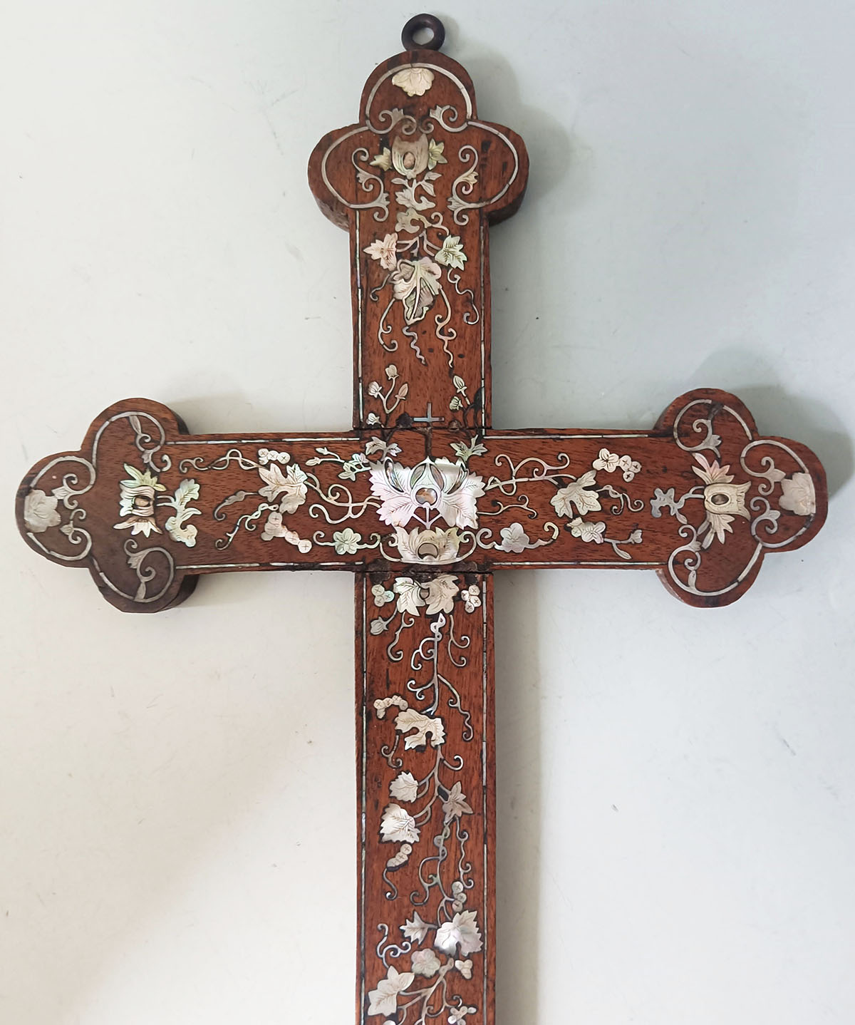 A finely crafted antique Christian cross in toned hardwood, intricately inlaid with luminous mother-of-pearl in scrolling floral and foliate motifs. The cross features a trefoil-shaped terminal design and a small suspension ring at the top for wall hanging.