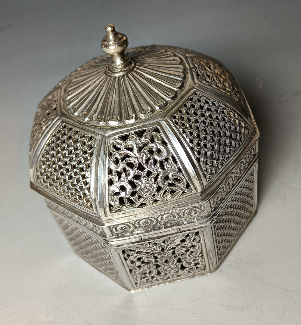 A beautiful Octagonal silver box with domed top with pierced floral design and fine geometric repousse embossed and chiselled decoration the domed lid which rises to a pointed finial.