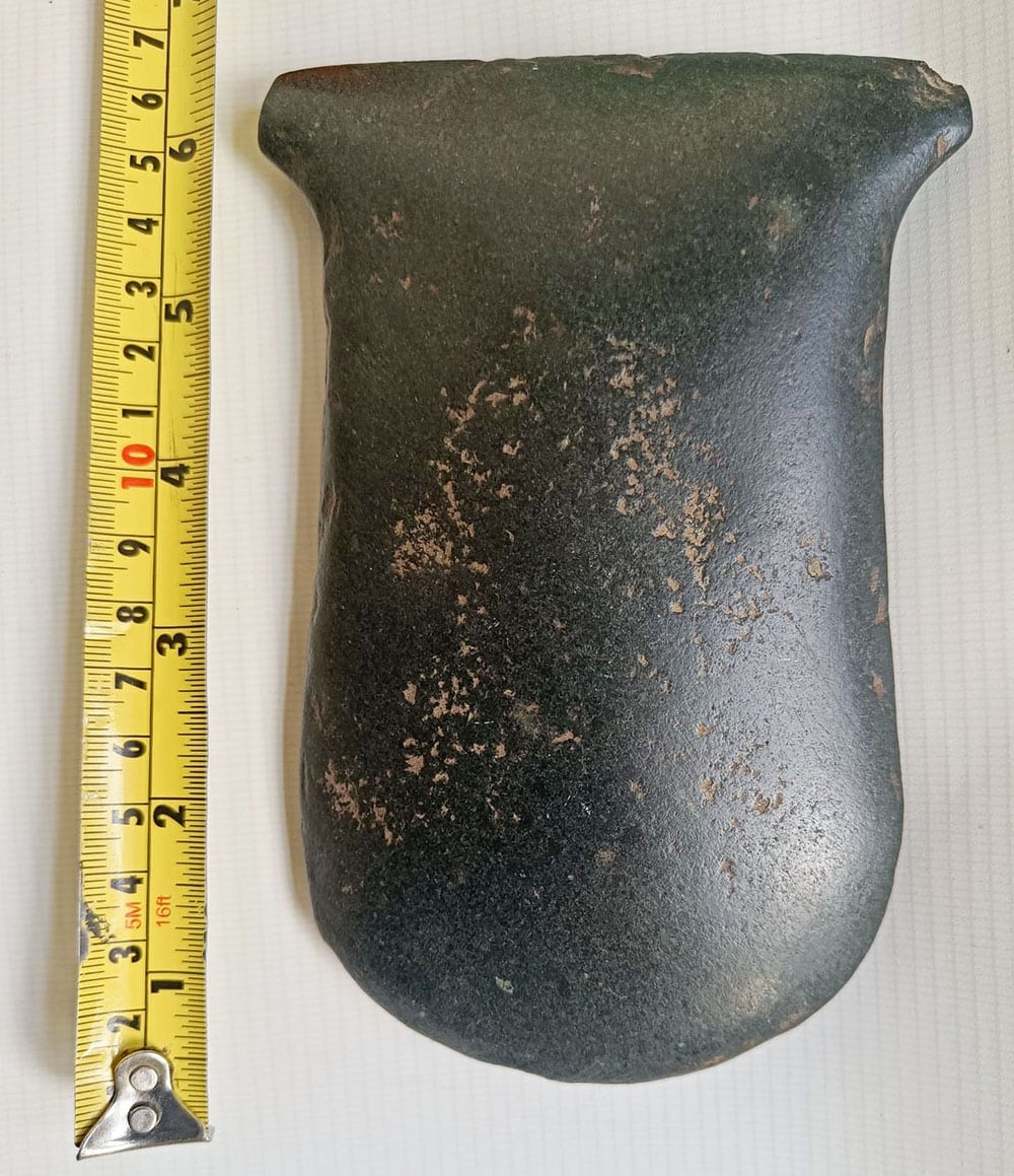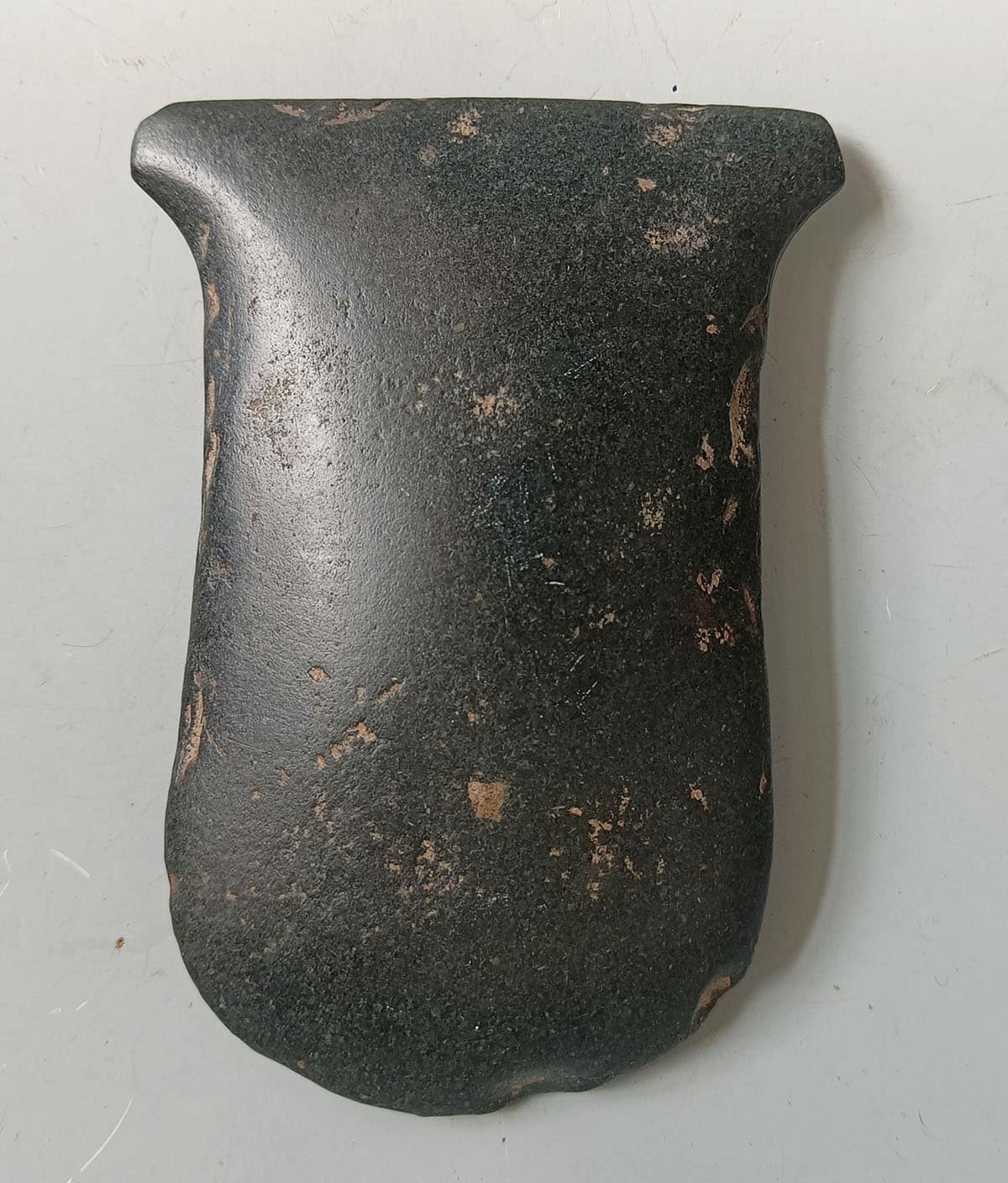 A dark green stone The surface shows a natural patina with wear consistent with age, the form suggests both practical use and ceremonial significance.