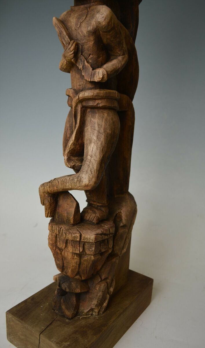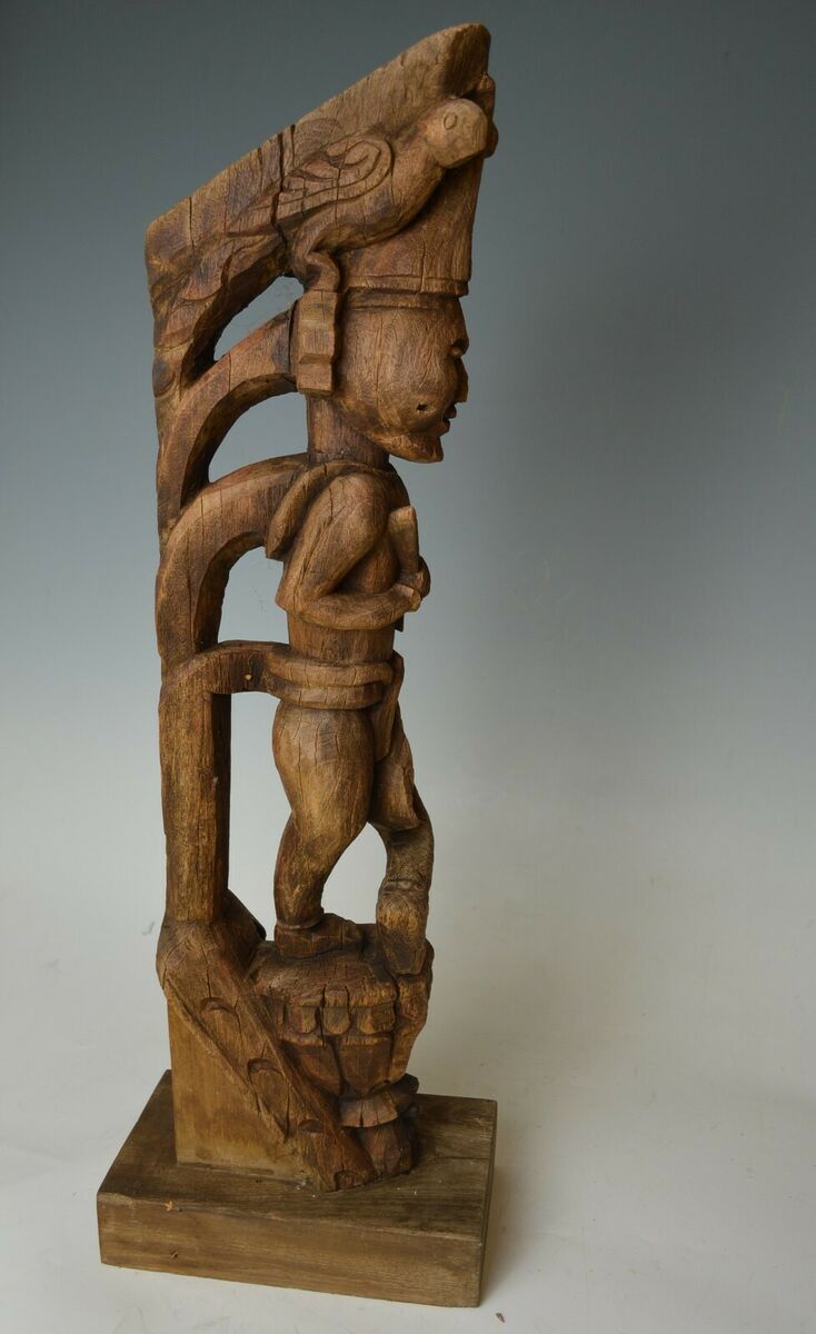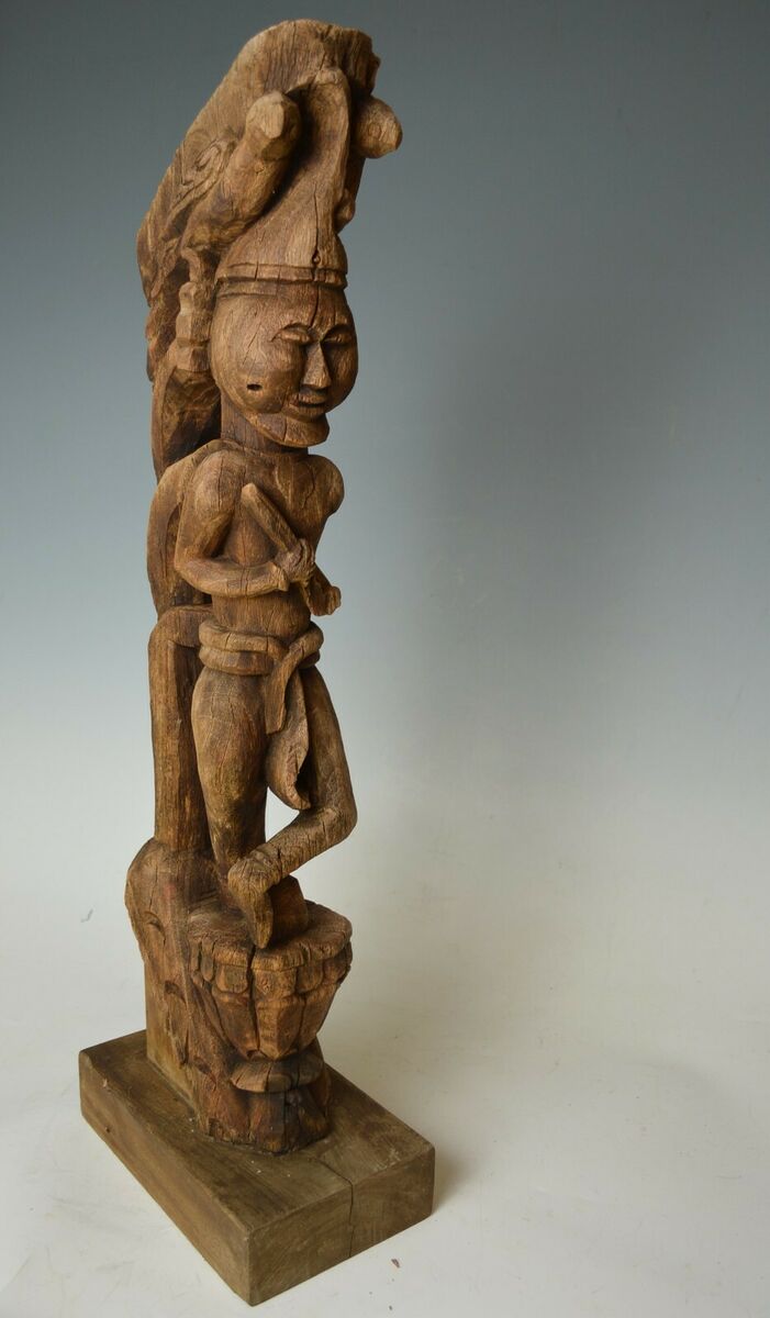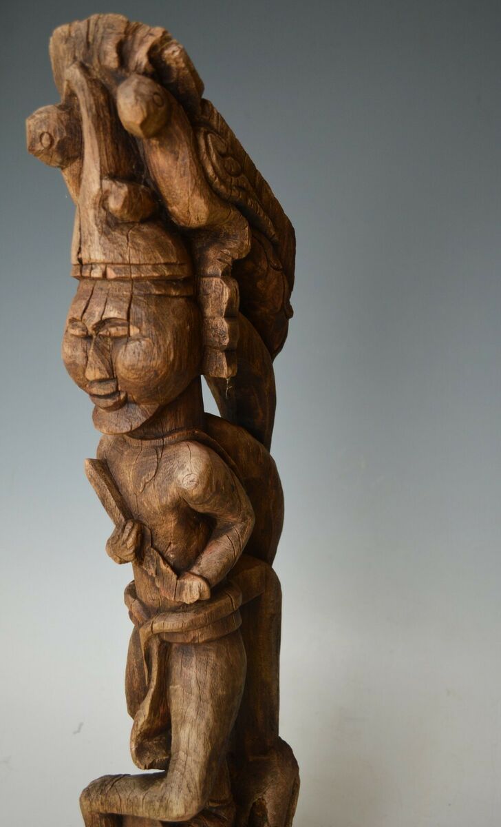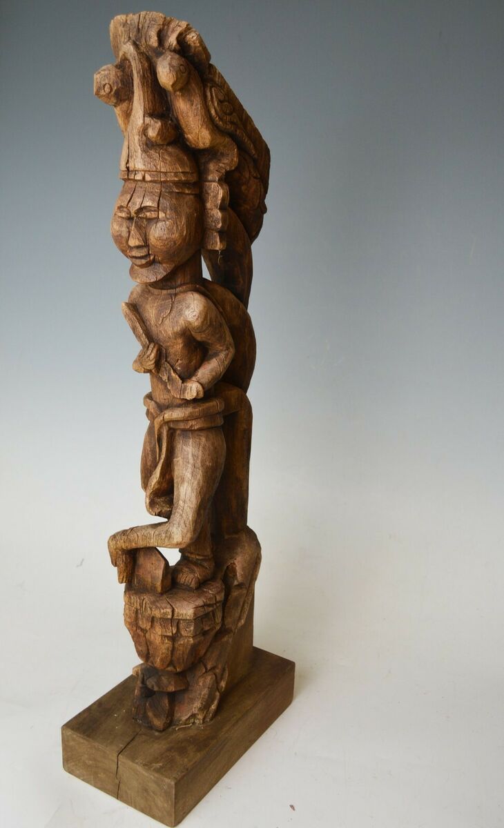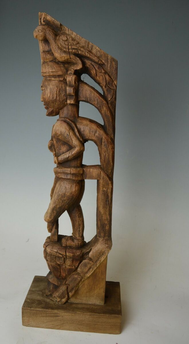 A fine Antique Indo Burmese bracket figure of standing figure in longhi raised on a traditional shaped pedestal surmounted by birds,