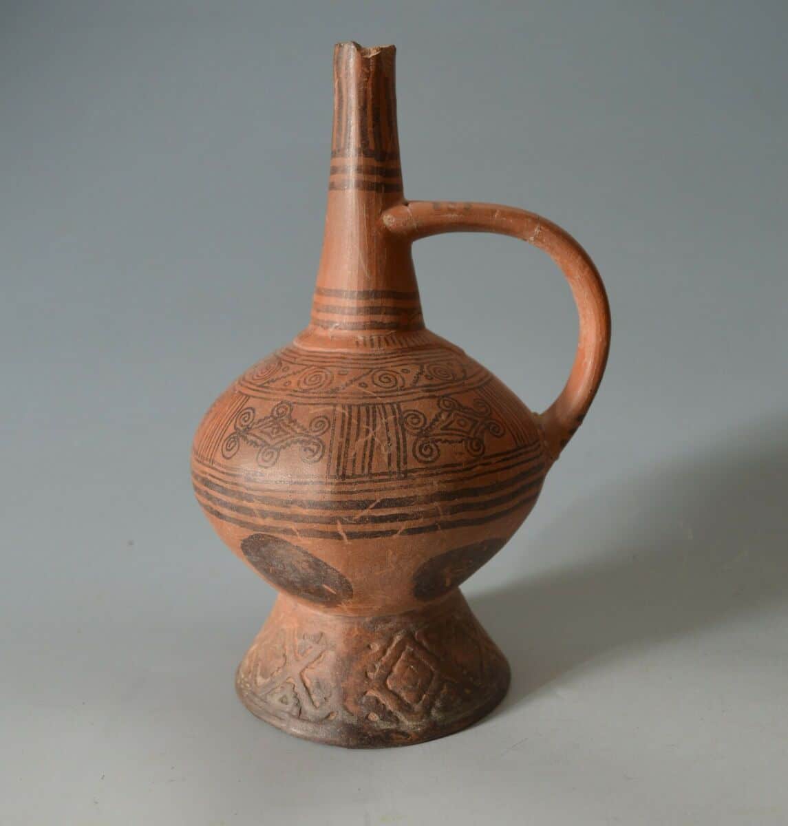 A tapering spouted vessel with impressed design on base in red clay with finely painted patterns in black negative resist