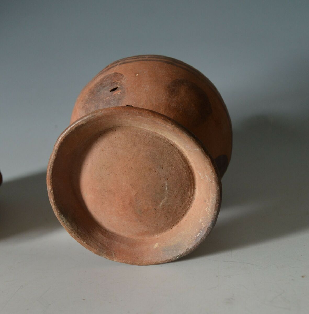Condition spout and handle reattached, 2 small holes, no restorations, showing root marks and age encrustation