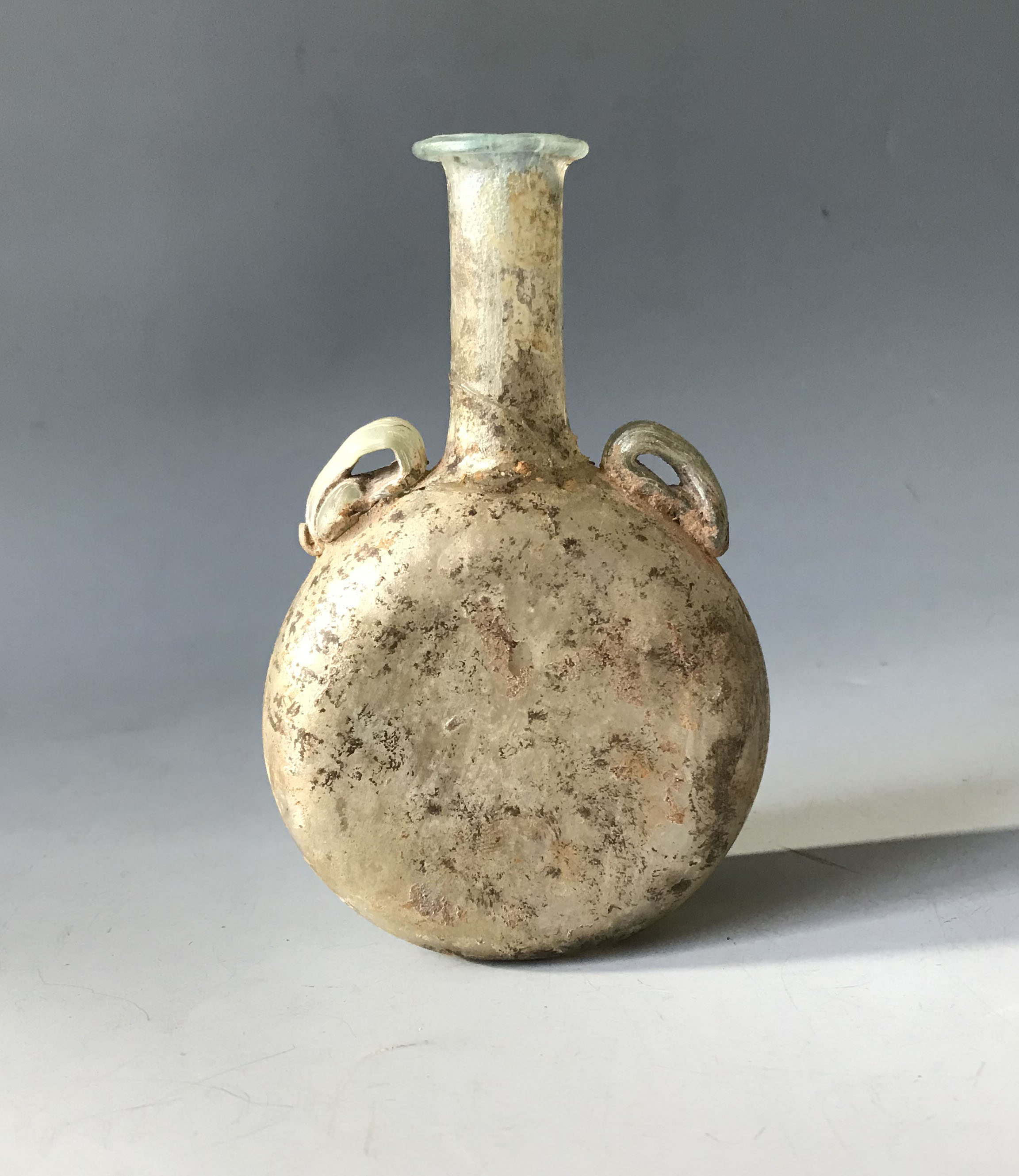 A ancient Roman glass flask with round flattened body with thin neck and 2 applied handles,